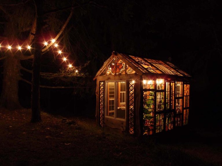 | A night time view of the Stained Glass Cabin by Neile Cooper. |